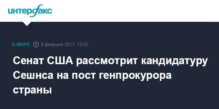 Москва. 8 февраля. INTERFAX.RU - Сенат США в среду проведет финальное голосование по кандидатуре сенатора Джеффа Сешнса, претендующего на пост генпрокурора страны, сообщает агентство Associated Press.