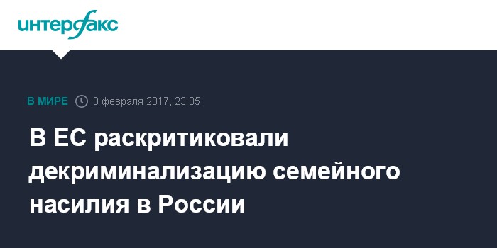 Москва. 8 февраля. INTERFAX.RU - Новое законодательство Российской Федерации, касающееся семейного насилия, явный шаг назад в обязательствах страны по борьбе с насилием в отношении женщин и детей, заявил официальный представитель Европейской внешнеполитической службы (ЕВС).