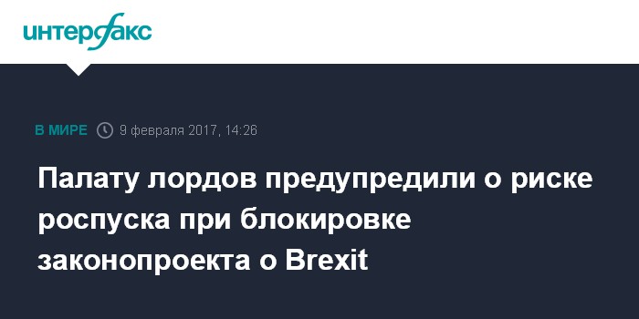Москва. 9 февраля. INTERFAX.RU -Палата лордов получила предупреждение о ее возможном роспуске, если ее члены решат заблокировать законопроект о выходе Великобритании из ЕС. Об этом сообщает британская телерадиовещательная корпорация "Би-би-си" со ссылкой на источник в правительстве.
