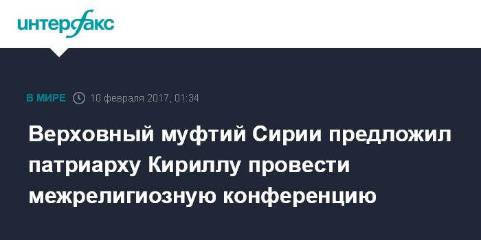 Москва. 10 февраля. INTERFAX.RU - Межрелигиозную конференцию с участием глав всех муфтиятов России предложил провести верховный муфтий Сирии Ахмад Бадретдин Хассун Святейшему патриарху Московскому и всея Руси Кириллу, сообщил "Интерфаксу" в пятницу представитель патриарха Кирилла при патриархе Антиохии и всего Востока игумен Арсений (Соколов).