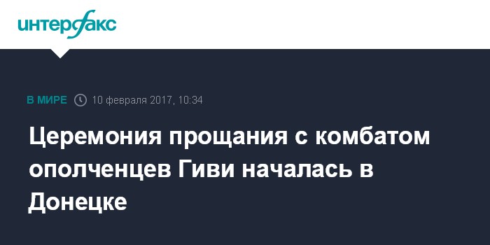 Москва. 10 февраля. INTERFAX.RU - В Донецке началась церемония прощания с командиром батальона "Сомали" ополченцев самопровозглашенной Донецкой народной республики Михаилом Толстых (Гиви), убитым 8 февраля в результате покушения.