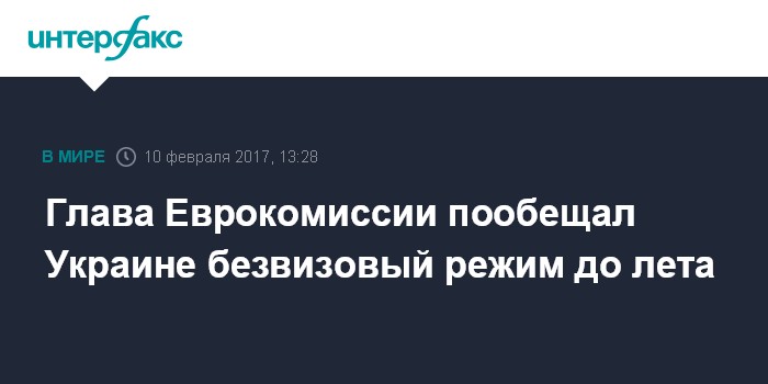 Москва. 10 февраля. INTERFAX.RU - Председатель Европейской комиссии Жан-Клод Юнкер заявляет, что безвизовый режим будет предоставлен Украине до лета.
