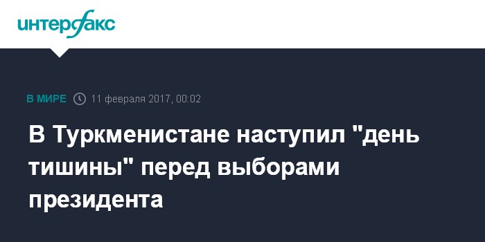 Москва. 11 февраля. INTERFAX.RU - В субботу в Туркменистане наступил "день тишины" накануне начала голосования на выборах президента, которые пройдут 12 февраля. В пятницу в стране завершилась предвыборная агитация, которая длилась с начала регистрации кандидатов на высшую государственную должность в Туркменистане - 24 декабря 2016 года.