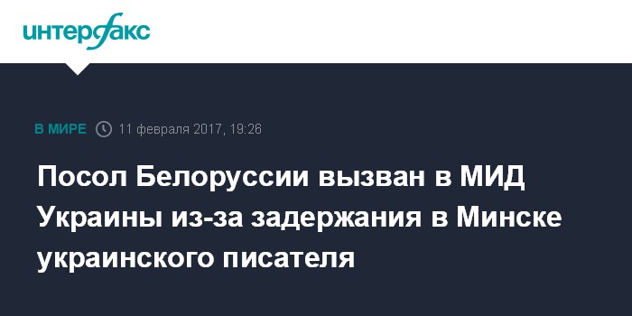 Москва. 11 февраля. INTERFAX.RU - МИД Украины вызвал посла Белоруссии на Украине Игоря Сокол в связи с задержанием в Минске украинского писателя Сергея Жадана.