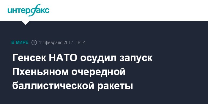 Москва. 12 февраля. INTERFAX.RU - Провокации, каковыми являются запуски баллистических ракет Северной Кореей, подрывают региональную и международную безопасность, заявил в воскресенье генеральный секретарь НАТО Йенс Столтенберг.