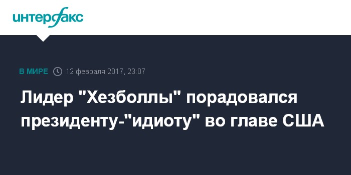Москва. 12 февраля. INTERFAX.RU - Лидер ливанской группировки "Хезболла" Хасан Насралла заявил, что рад тому, что Соединенные Штаты возглавляет "идиот", пишет в воскресенье The Hill. По мнению Насраллы, это дает надежду "угнетенным" по всему миру.