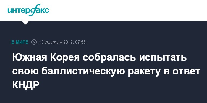 Москва. 13 февраля. INTERFAX.RU - После ракетных пусков, которые осуществляет Северная Корея, в Сеуле рассматривают возможность проведения испытания своей баллистической ракеты, сообщило в понедельник южнокорейское агентство "Рёнхап" со ссылками на военные источники.