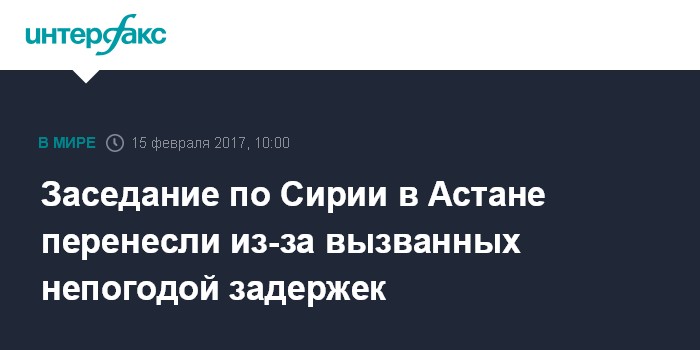 Москва. 15 февраля. INTERFAX.RU - Перенос пленарного заседания в рамках встречи по Сирии в Астане произошел из-за задержки делегаций Турции и сирийской оппозиции по причине непогоды, сообщил "Интерфаксу" источник в российской делегации.