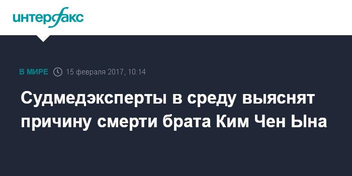 Москва. 15 февраля. INTERFAX.RU - В больнице столицы Малайзии Куала-Лумпура в среду планируется провести вскрытие тела умершего накануне Ким Чон Нама, сводного брата северокорейского лидера Ким Чен Ына, сообщает малайзийская пресса. В ходе вскрытия планируется выяснить, что стало причиной его смерти.