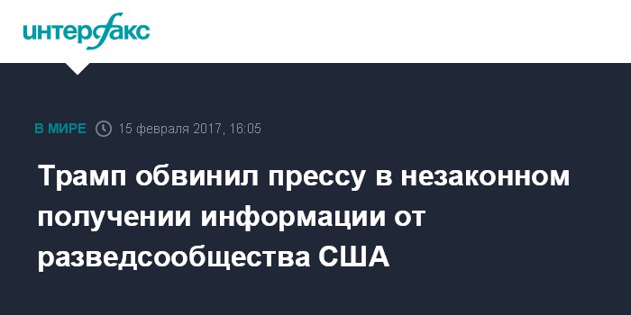 Москва. 15 февраля. INTERFAX.RU - Президент США Дональд Трамп назвал незаконной передачу информации в прессу со стороны разведывательного сообщества.