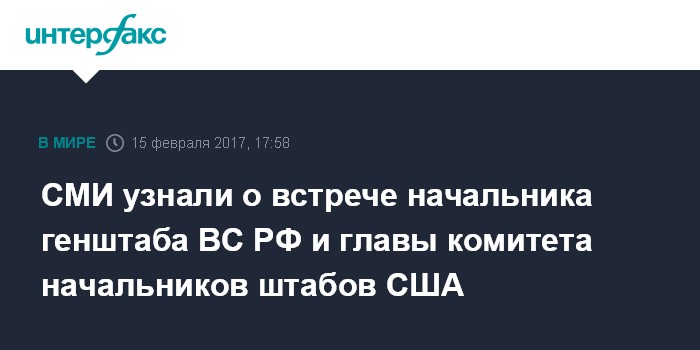 Москва. 15 февраля. INTERFAX.RU - Глава комитета начальников штабов ВС США Джозеф Данфорд 16 февраля проведет в Баку встречу с начальником генштаба ВС РФ Валерием Герасимовым. Об этом сообщает в среду агентство Bloomberg со ссылкой на заявление американских военных.