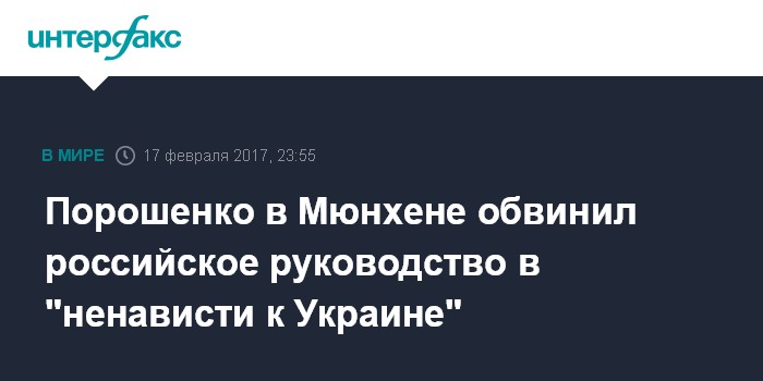 Москва. 17 февраля. INTERFAX.RU - Президент Украины Петр Порошенко во время выступления на 53-й Мюнхенской конференции обвинил в "ненависти к Украине" российское руководство.