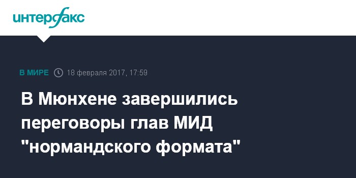 Москва. 18 февраля. INTERFAX.RU - В Мюнхене завершились переговоры министров иностранных дел Украины, Германии, Франции и России, передает корреспондент "Интерфакса".