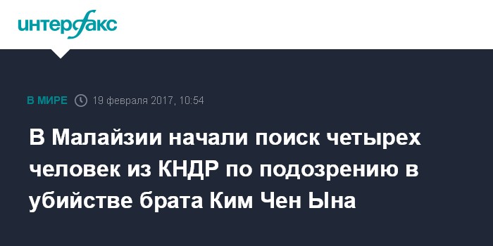 Москва. 19 февраля. INTERFAX.RU - Четыре выходца из Северной Кореи разыскиваются малайзийскими спецслужбами по подозрению в причастности к убийству брата северокорейского руководителя Ким Чен Нама, сообщил журналистам представитель полиции Малайзии.
