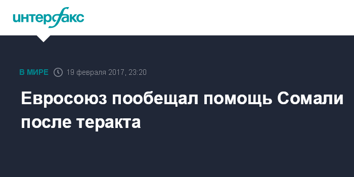Москва. 19 февраля. INTERFAX.RU - Террористический акт против гражданских лиц в воскресенье в Могадишо направлен на подрыв стабильности и безопасности Сомали, заявил официальный представитель Европейской внешнеполитической службы (ЕВС).