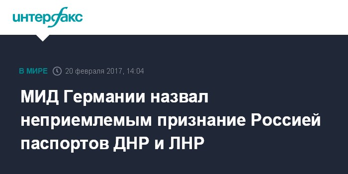 Москва. 20 февраля. INTERFAX.RU - В немецком МИД в понедельник назвали "неприемлемым" признание Россией паспортов самопровозглашенных республик Донбасса, сообщили местные СМИ.