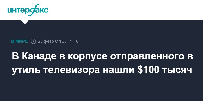 Москва. 20 февраля. INTERFAX.RU - Более $100 тысяч наличными было найдено в старом телевизоре, который отправили на завод по переработке отходов в канадской провинции Онтарио.