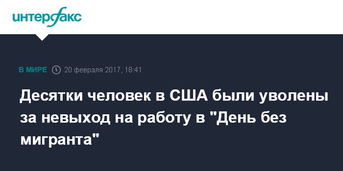 Москва. 20 февраля. INTERFAX.RU - Более сотни жителей США, которые в четверг 16 февраля не вышли на работу, предпочтя принять участие в акциях протеста под общим названием "День без мигранта", в пятницу обнаружили, что были уволены.