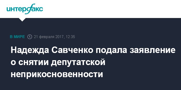 Москва. 21 февраля. INTERFAX.RU - Народный депутат Украины Надежда Савченко сообщила, что написала заявление о снятии с себя депутатской неприкосновенности, но сомневается, что Верховная рада проголосует за соответствующее решение.