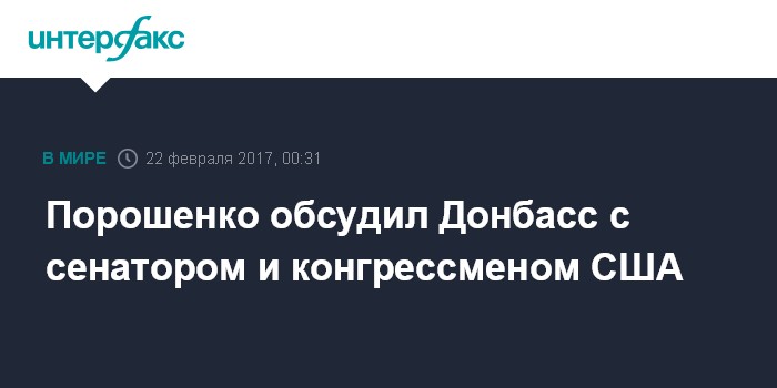 Порошенко подробно проинформировал сенатора и конгрессмена об эскалации ситуации в Донбассе и продолжающихся провокациях и нарушениях режима прекращения огня. Собеседники отметили необходимость сохранения и усиления международных санкций в отношении РФ до полного выполнения минских договоренностей, а также восстановления суверенитета и территориальной целостности Украины, включая Крым.