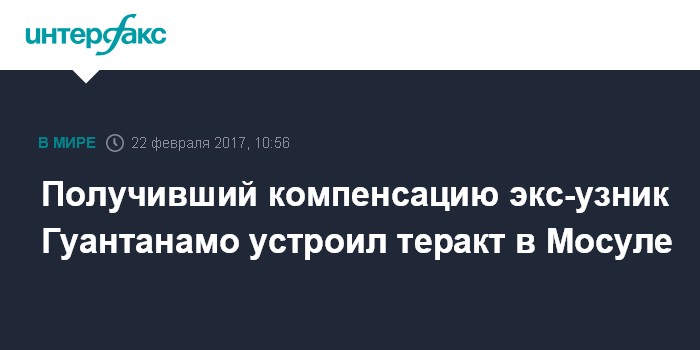 Москва. 22 февраля. INTERFAX.RU - Террорист-смертник из группировки "Исламское государство" (ИГ запрещена в РФ), устроивший в феврале теракт югу от иракского Мосула, был гражданином Великобритании и бывшим узником тюрьмы в Гуантанамо, за страдания в которой он получил крупную компенсацию - 1 млн фунтов стерлингов, сообщает в среду британская газета The Daily Mail.