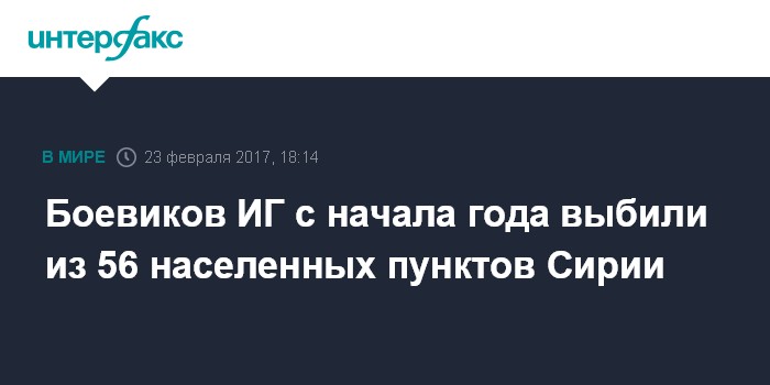 Москва. 23 февраля. INTERFAX.RU - В Сирии с начала 2017 года боевиков террористической группировки ИГИЛ (запрещена в РФ) выбили из 56 населенных пунктов, сообщили в Минобороны России.