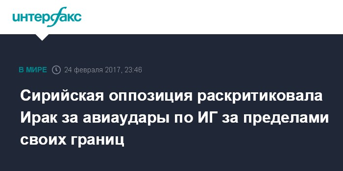 Москва. 24 февраля. INTERFAX.RU - Свободная сирийская армия считает нелегитимным нанесение авиаударов ВВС Ирака по позициям ИГ (группировка запрещена в РФ) в Сирии, сообщил "Интерфаксу" в пятницу представитель группы вооружённой оппозиции, полковник Свободной сирийской армии Фарес Аль-Бабеш.