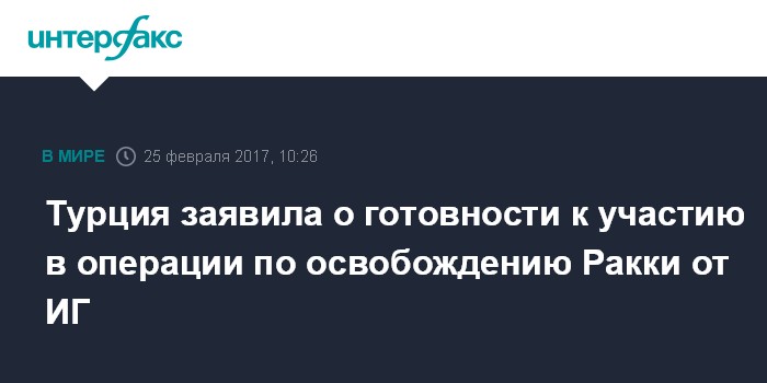 Москва. 25 февраля. INTERFAX.RU - Глава МИД Турции Мевлют Чавушоглу заявил, что Анкара готова к участию в операции по освобождению сирийской Ракки от боевиков террористической группировки "Исламское государство" (ИГ запрещена в РФ) и обсудила этот вопрос с участниками международной коалиции.