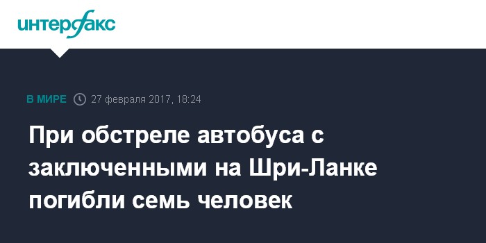 Москва. 27 февраля. INTERFAX.RU - Группа неизвестных открыла огонь по перевозившему заключенных автобусу близ столицы Шри-Ланки, в результате чего погибли пять заключенных и два охранника, сообщает в понедельник телерадиокорпорация "Би-Би-Си".