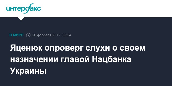 Москва. 28 февраля. INTERFAX.RU - Бывший премьер-министр Украины, лидер партии "Народный фронт" Арсений Яценюк заявляет, что не собирается становиться главой национального банка Украины.