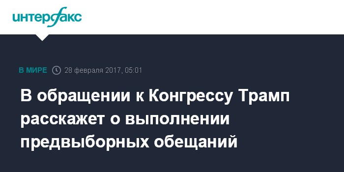 Выступание даст президенту возможность "переместить фокус внимания его молодой администрации на насущные экономические проблемы, что помогло ему победить на выборах", отмечает агентство. "Советники Трампа заявили, что он использует речь для того, чтобы декларировать прогресс в реализации предвыборных обещаний, включая выход США из Транстихоокеанского партнерства и следование по тернистому пути законодательных приоритетов, таких, как здравоохранение и расходы на инфраструктуру".