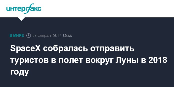 Москва. 28 февраля. INTERFAX.RU - Двое космических туристов начнут подготовку к полету вокруг Луны в 2018 году, они уже внесли крупный депозит, сообщил генеральный директор американской компании SpaceХ Илон Маск. "Следующий год будет большим годом для отправки людей на космическую станцию и, надеюсь, за ее пределами", - сказал Маск журналистам.