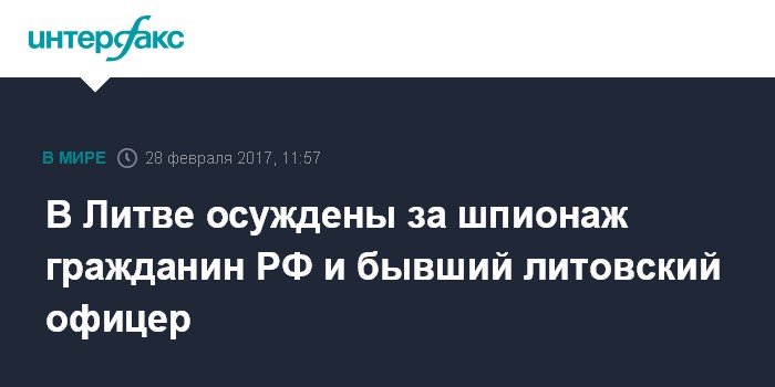 Москва. 28 февраля. INTERFAX.RU - В Литве Шяуляйский окружной суд во вторник вынес приговор обвиняемым в шпионаже бывшему офицеру Вооруженных сил (ВС) Литвы и гражданину России.
