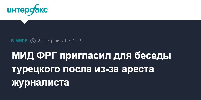 Москва. 28 февраля. INTERFAX.RU - Посол Турции в ФРГ был приглашен в германский МИД в связи с арестом в Турции немецкого журналиста Дениза Юсела, говорится в сообщении, распространенном во вторник в твиттере МИД ФРГ.