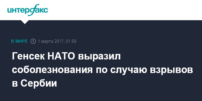 Москва. 1 марта. INTERFAX.RU - Генеральный секретарь НАТО Йенс Столтенберг заявил о своей печали по случаю взрывов на военном предприятии в Крагуеваце, в Сербии, и выразил соболезнования тем, кого затронуло это событие, и сербскому народу.