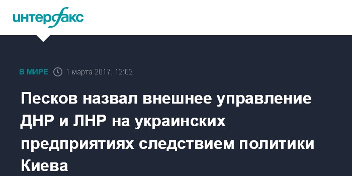 Песков назвал внешнее управление ДНР и ЛНР на украинских предприятиях следствием политики Киева