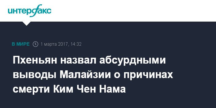 Москва. 1 марта. INTERFAX.RU - Власти КНДР назвали абсурдным заключение малайзийских судмедэкспертов о том, что старший сводный брат лидера страны Ким Чен Ына Ким Чен Нам был отравлен в Куала-Лумпуре высокотоксичным веществом VX.