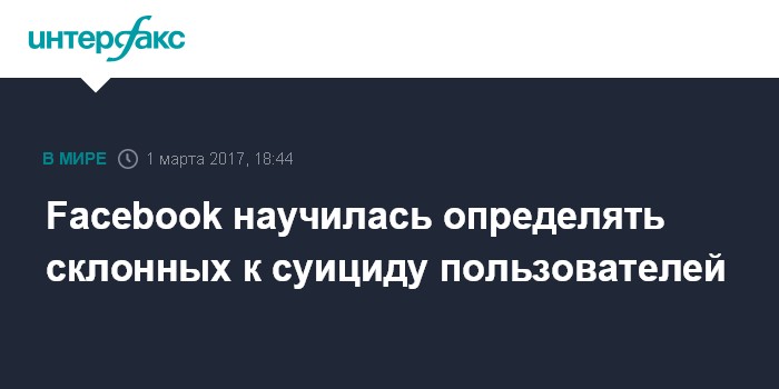Москва. 1 марта. INTERFAX.RU - Социальная сеть Facebook начала использовать искусственный интеллект (ИИ) для выявления пользователей, которые могут быть склонны к суициду. Об этом пишет "Би-би-си".