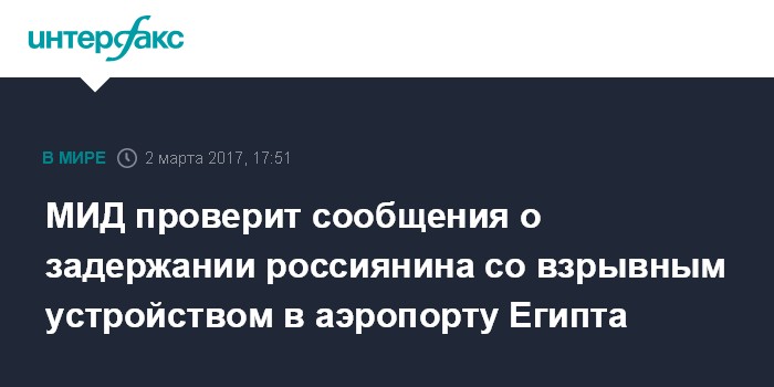 Москва. 2 марта. INTERFAX.RU - Российские дипломаты находятся в контакте с властями в Египте и проверяют информацию о задержании гражданина РФ со взрывным устройством в аэропорту Александрии, сообщили в четверг в генконсульстве РФ в этом египетском городе.