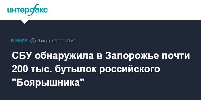 Москва. 3 марта. INTERFAX.RU - Сотрудники Службы безопасности Украины обнаружили в Запорожье около 200 тысяч бутылок спиртосодержащей продукции "Лосьон косметический "Боярышник" российского производства.