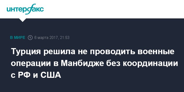 Москва. 6 марта. INTERFAX.RU - Турция не планирует военную операцию в сирийском городе Манбидже без согласования действий с США и Россией, у которых есть военное присутствие на этой территории. Об этом заявил премьер-министр Турции Бинали Йылдырым.