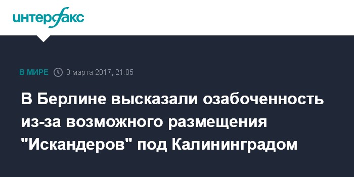 Москва. 8 марта. INTERFAX.RU - Размещение Россией ракет "Искандер-М" в Калининградской области на постоянной основе вызовет озабоченность у Берлина и приведет к деградации в обеспечении безопасности в Европе, заявил новый глава МИД Германии Зигмар Габриэль.