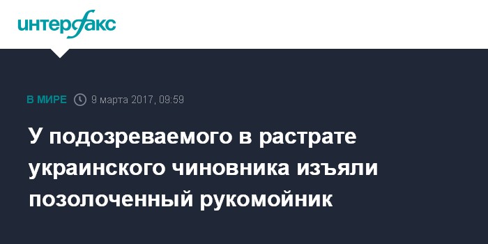 Москва. 9 марта. INTERFAX.RU - На Украине обнаружили позолоченный рукомойник при обыске у подозреваемого в растрате директора госпредприятия "Электровозбудування" ("Электровозостроение") Александра Зельдина, сообщил генпрокурор Украины Юрий Луценко.
