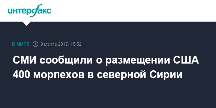 Москва. 9 марта. INTERFAX.RU - Американское командование международной коалиции против группировки "Исламское государство" (ИГ, запрещена в РФ) сообщило о размещении 400 морских пехотинцев на севере Сирии, передает в четверг арабское издание "Аль-Масдар".