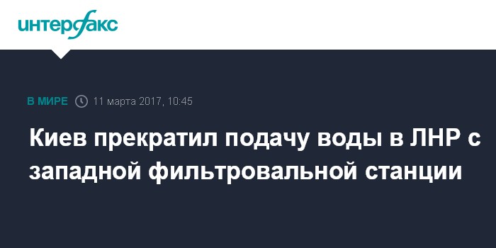 Москва. 11 марта. INTERFAX.RU - Украинская сторона без предупреждения прекратила подачу воды на территорию самопровозглашенной Луганской народной республики с западной фильтровальной станции (ЗФС), сообщили в пресс-службе предприятия "Лугансквода".