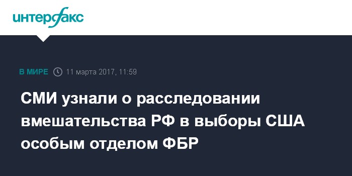 Москва. 11 марта. INTERFAX.RU - Контрразведывательный департамент ФБР будет вести расследование по делу о вмешательстве России в президентские выборы в США, сообщил телеканал CNN со ссылкой на неназванного высокопоставленного представителя американской администрации.