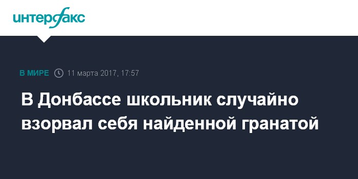 Москва. 11 марта. INTERFAX.RU - Возвращавшийся домой с занятий в школе искусств ученик седьмого класса погиб в Угледаре от взрыва гранаты, сообщает в субботу полиция Донецкой области Украины.