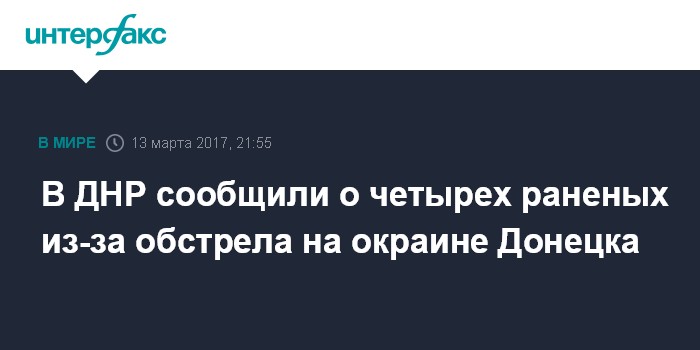 Москва. 13 марта. INTERFAX.RU - Четверо мирных жителей пострадали на северной окраине Донецка в результате обстрела со стороны украинских военных, сообщает в понедельник Донецкое агентство новостей (ДАН) со ссылкой на источник в силовых ведомствах самопровозглашенной Донецкой народной республики.