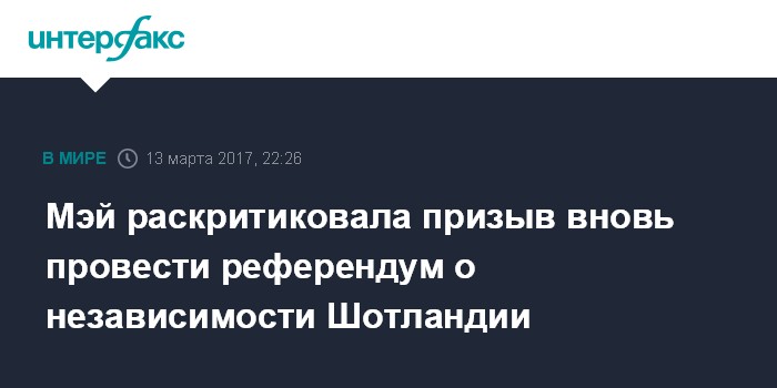 Москва. 13 марта. INTERFAX.RU - Глава правительства Великобритании Тереза Мэй в понедельник раскритиковала Шотландскую национальную партию, стремящуюся к проведению очередного референдума о выходе Шотландии из состава Соединенного Королевства.