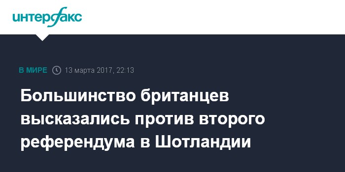 Москва. 13 марта. INTERFAX.RU - Две трети подданных Великобритании высказываются против проведения второго референдума о независимости Шотландии, сообщает в понедельник британский телеканал Sky news со ссылкой на собственный опрос.